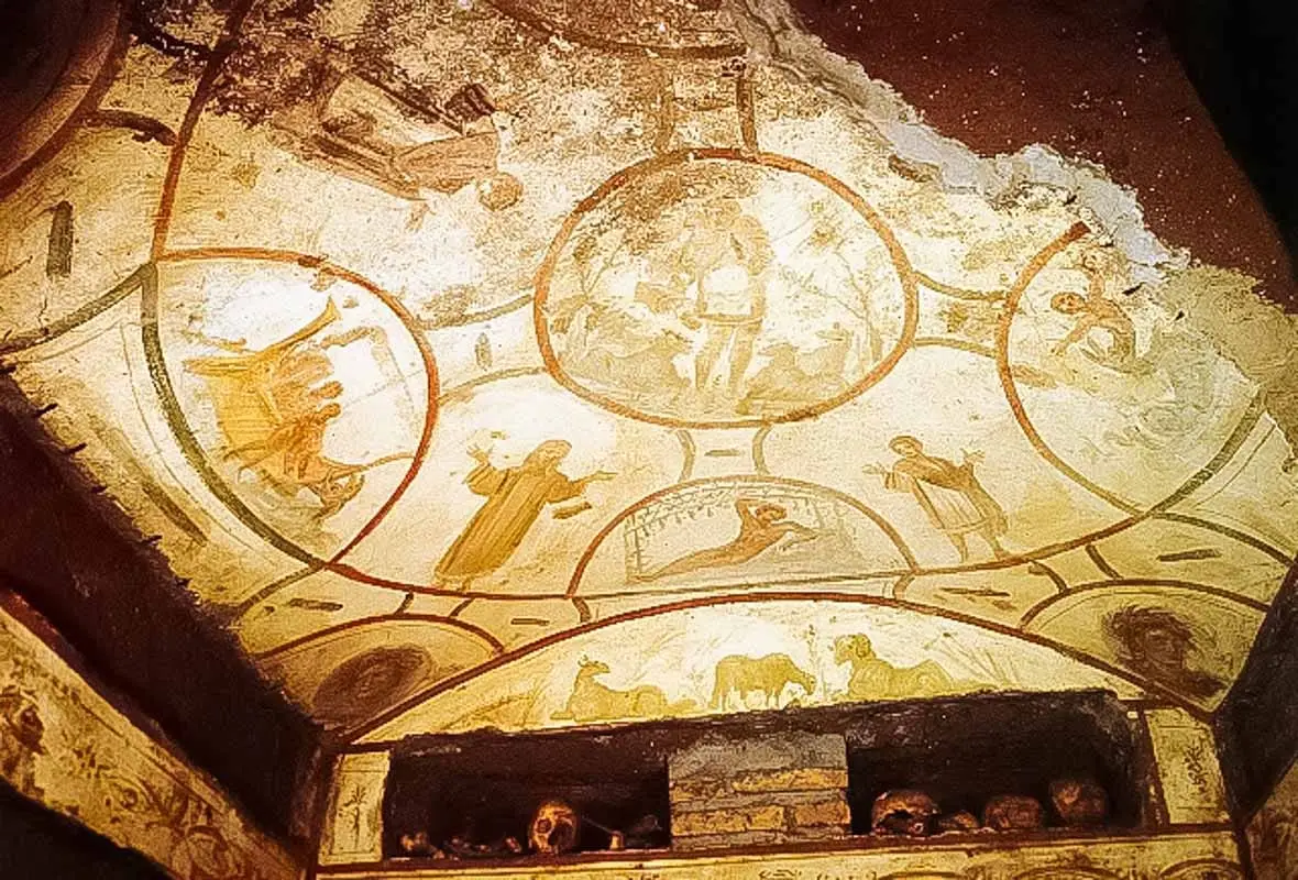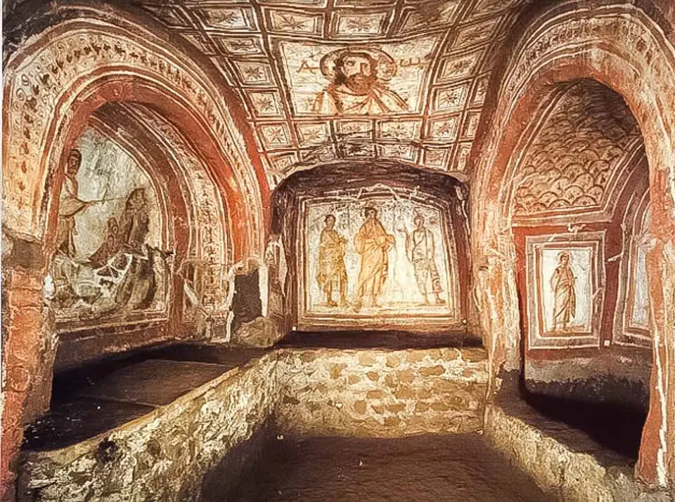 Să vedem. În primele Biserici din Roma, creștinii aveau cimitirele în catacombe. Se spune că chiar se adunau acolo și se făceau slujbe pe timpuri de persecuție. Iar aceste locuri sunt pline de imagini!